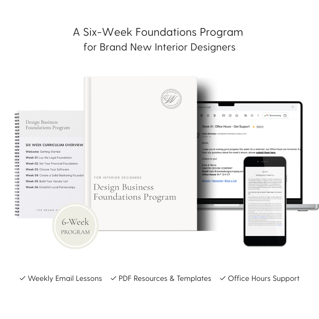 It’s a step-by-step curriculum to guide you through laying the vital pillars of your business’s foundation. Access easy-to-use templates and tools, actionable advice, industry how-to’s, AND six weeks of expert support from me and our in-house design professor (who is also a trained interior designer.)